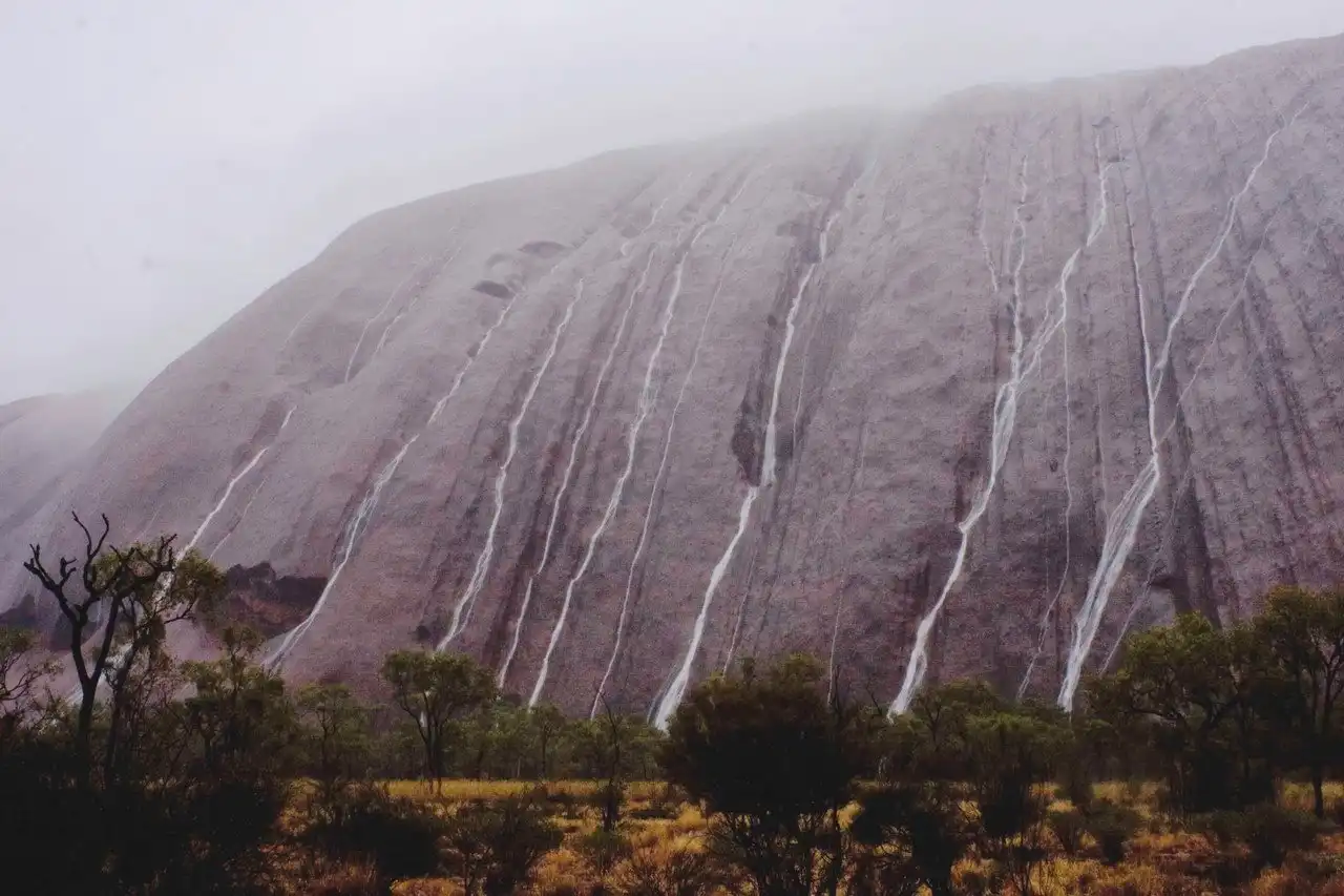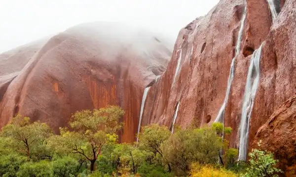 Скала имеет овальную форму диаметром, который колеблется от 3 до 3,5 километра. Расположена Улуру практически в самом центре зеленого континента. Она внесена в список объектов Всемирного наследия ЮНЕСКО. Ежегодно, к этой скале приезжает около полумиллиона туристов. Однако, только нескольким тысячам удается увидеть уникальное явление, когда со скалы каскадами ниспадают потоки воды. В периоды дождей, с ноября по март, даже в такой засушливой местности выпадает немалое количество осадков. Именно они и формирую эти временные водопады.