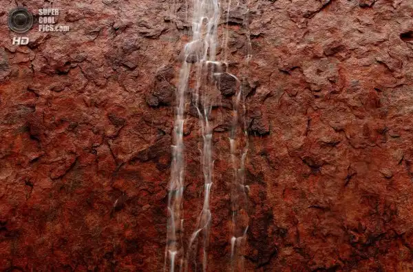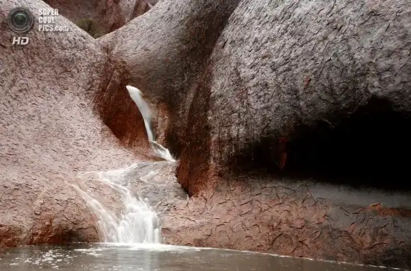 Фотографии показывают как водные потоки скатываются водопадами по каменным склонам Ayer’s Rock. Эта местность известна как самая засушливая точка в Красном Центре Австралии с каменным холмом возвышающимся на 350 метров над уровнем моря, которую местные аборигены называют Улуру.