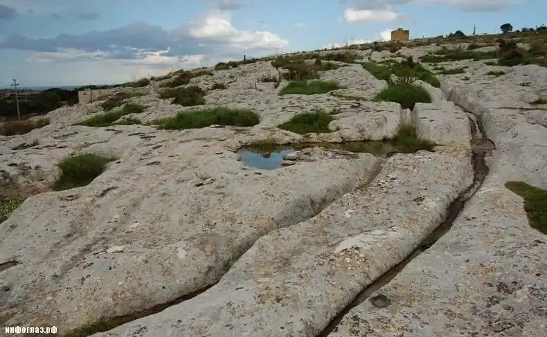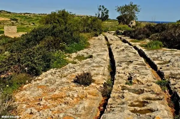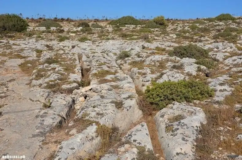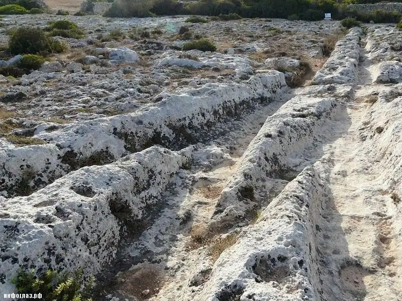 Средиземноморские острова Мальта и Гозо называют «остатками Атлантиды» и «европейской пустыней Наска» из-за одной особенности: там, где на поверхность выходят коренные породы, почти всюду видны параллельные борозды или колеи. Эти колеи иногда уходят под воду, где скрываются под слоями ила и песка. Когда-то их было больше, но за истекшие века многие колеи исчезли под домами и дорогами.