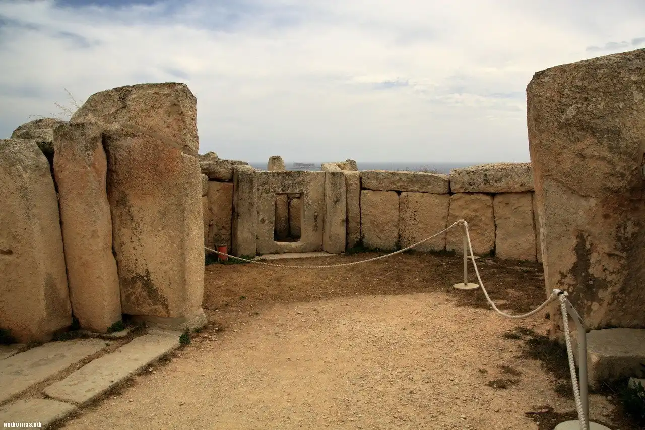 Не менее впечатляют и наземные мегалитические сооружения острова. Все слышали о легендарном Стоунхендже в Великобритании, но не все знают, что на Мальте имеется несколько подобных построек из огромных каменных глыб. Крупнейший из храмовых комплексов называется Хаджар-Им. Безымянные строители возвели его в 3600-3200 годах до н. э. В качестве строительного материала был использован местный известняк. Планировка храма вполне типична для остальных подобных сооружений на Мальте – он состоит из нескольких помещений округлой формы, соединенных между собой ходами. Главный вход сложен из массивных каменных плит – двух вертикальных и двух горизонтальных.