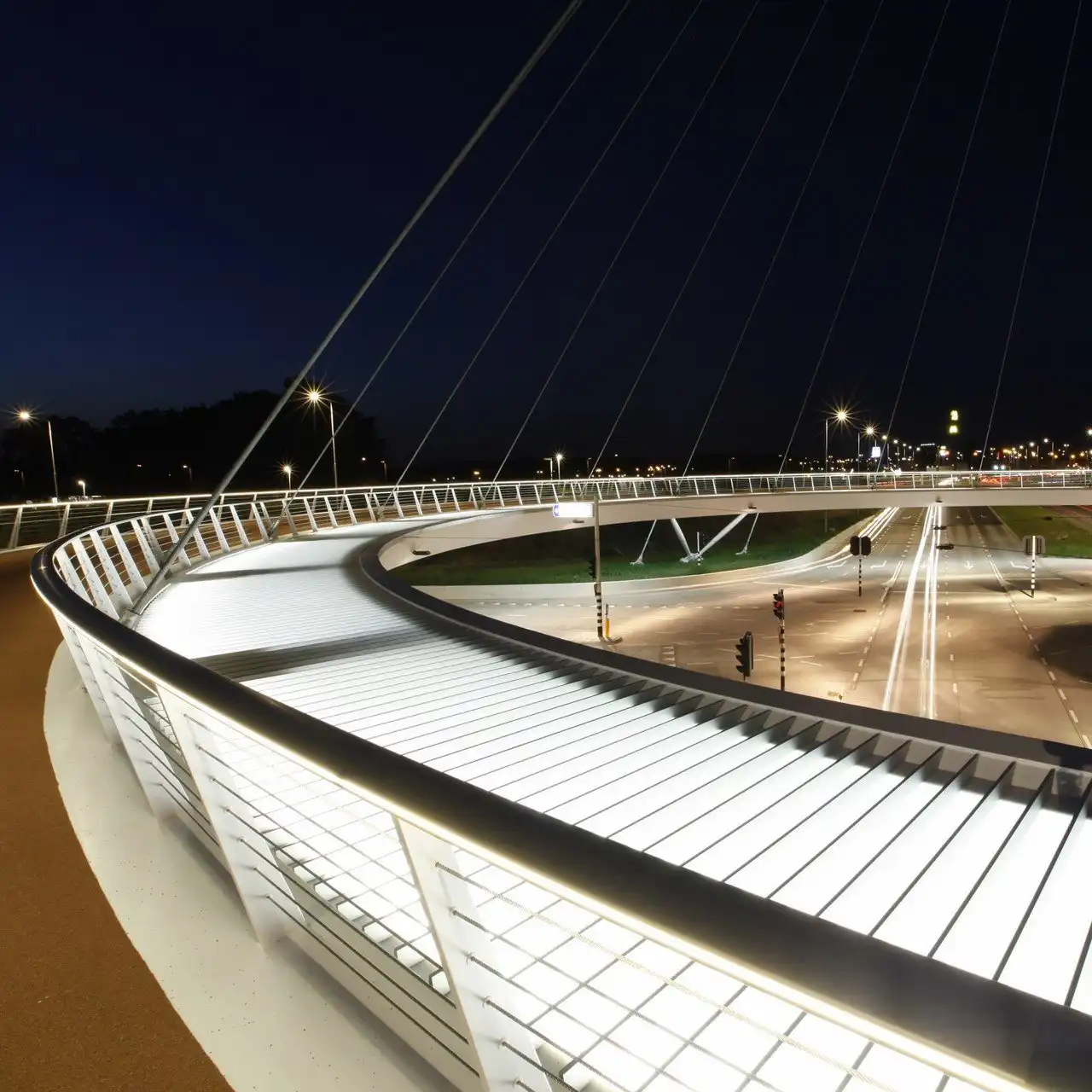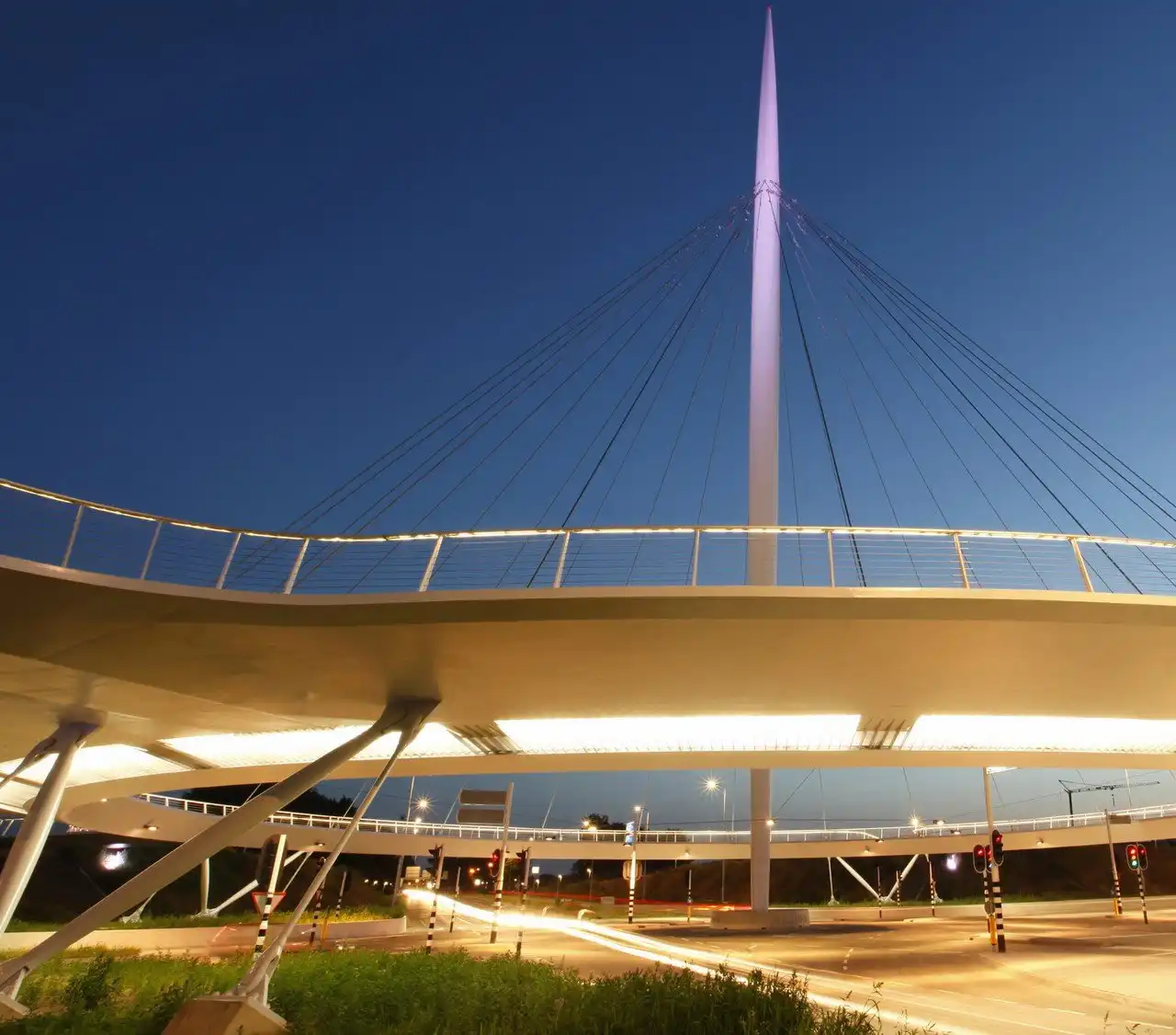 От опоры к мосту протянуты 24 стальных троса. По сути, мост находится не в Эйндховене, а на его границе с городком Вельдховен. Открыть мост сразу не удалось из-за слишком сильной вибрации.