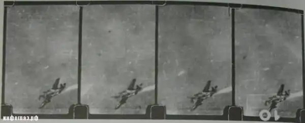 Кадры ФКП с Ла-7 Кожедуба, запечатлевшие последние секунды полета американского «Мустанга», опрометчиво атаковавшего советского аса в берлинском небе 17 апреля 1945 г.