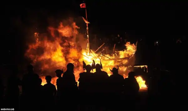Вечером факельная процессия по старинному обряду погребения умерших воинов сжигает деревянную ладью викингов на побережье — 900 горящих факелов бросают на «древний» корабль. Зрелище впечатляющее! Таков обычай викингов, принятый для похорон воинов и вождей.