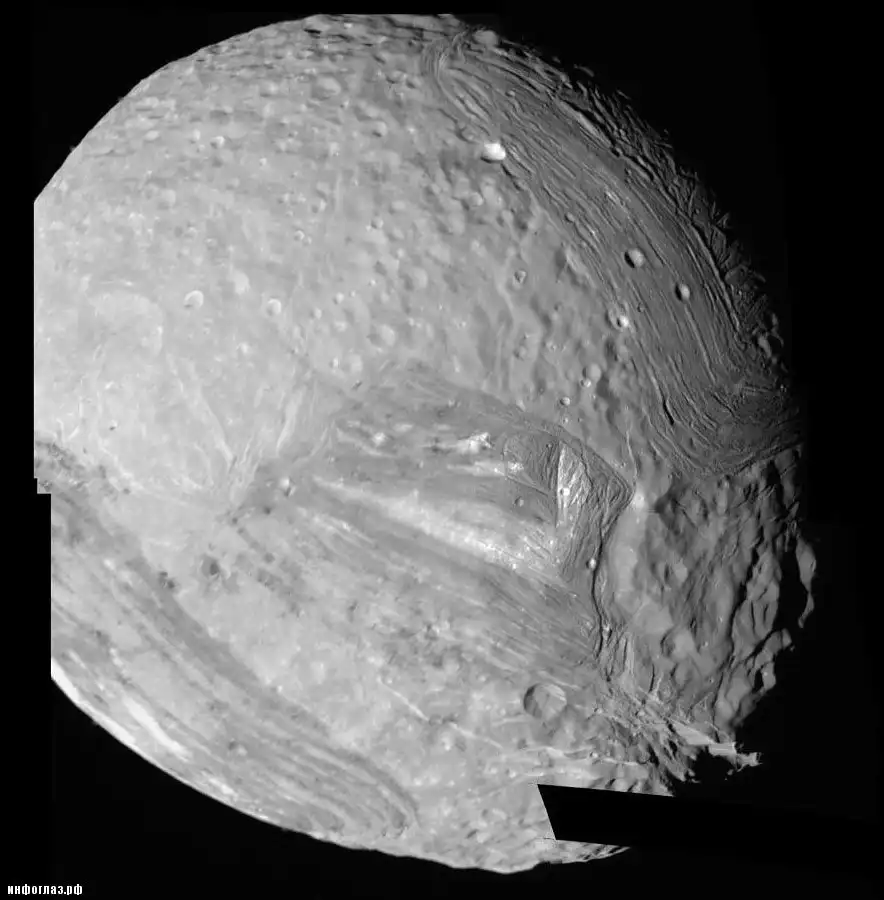 Миранда — это странный мир, у которого наверняка было бурное прошлое. Самый близкий к Урану из его больших спутников, Миранда имеет диаметр около 300 миль и была открыта в 1948 году американским исследователем планет Жераром Койпером. Весьма подробно исследованный космическим аппаратом Вояджер 2 в 1986 г., этот далекий темный мир оказался достаточно необычным. На Миранде были обнаружены уникальные, непонятные особенности рельефа, позволяющие предположить, что она подвергалась разломам по крайней мере 5 раз за время эволюции. Наряду со знаменитым «шевроном» — яркой областью, имеющей форму буквы V прямо под центром этого монтажа из изображений Миранды с наивысшим разрешением, на нем можно увидеть беспорядочное наложение хребтов и долин, старые, покрытые кратерами, и гладкие молодые поверхности, темные каньоны глубиной до 12 миль. Большой кратер (ниже центра) — Алонсо, имеющий диаметр 15 миль.
