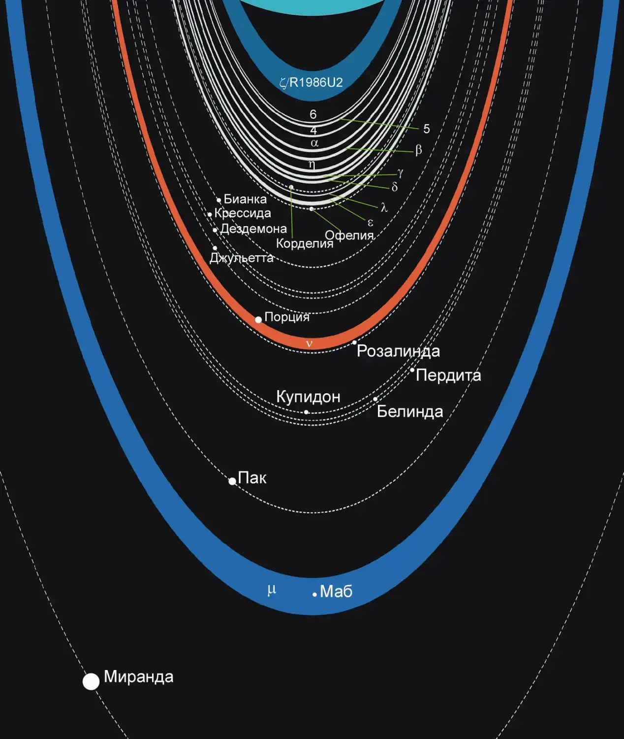 Так же, как и у других газовых гигантов Солнечной системы, у Урана имеется система колец и магнитосфера, а кроме того, 27 спутников. Ориентация Урана в пространстве отличается от остальных планет Солнечной системы — его ось вращения лежит как бы «на боку» относительно плоскости обращения этой планеты вокруг Солнца. Вследствие этого планета бывает обращена к Солнцу попеременно то северным полюсом, то южным, то экватором, то средними широтами.