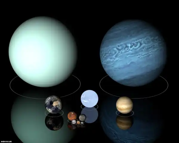 Это две планеты почти одинакового размера с похожим химическим составом; они меньше и плотнее Юпитера и Сатурна. Каждая из этих планет находится в центре миниатюрной системы спутников и колец.