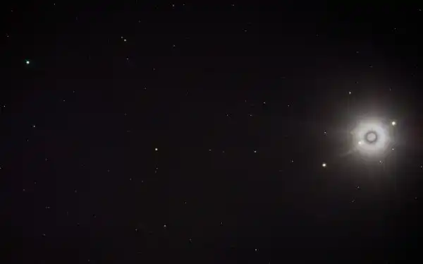 В конце сентября 2010 года две планеты Солнечной системы находились на земном небе ровно напротив Солнца — Юпитер и Уран. Следовательно, обе планеты были в самых близких к Земле точках своих орбит. Юпитер находился всего в 33 световых минутах от нас, а свет от Урана летел к нам 2.65 часа. Обе планеты были отлично видны в небольшие телескопы. Сегодняшняя тщательно спланированная композиция — результат сложения нескольких фотографий с различной выдержкой, полученных 27 сентября. На картинке отлично видны оба газовых гиганта, замеченные в таком особенном пространственном расположении, а также можно найти и самые яркие спутники. Слабый зелёный диск далёкого Урана находится в левом верхнем углу фотографии. Слева от диска можно заметить два из пяти имеющих названия самых больших спутников планеты. В правой части изображения царит величественный газовый гигант Юпитер. Четыре его галилеевых спутника выстроились в ряд. Самый далёкий — это Каллисто. Он находится слева.