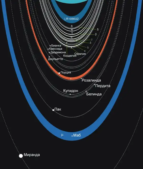 Несмотря на сложность наземных наблюдений таких слабых далеких объектов, как спутники Урана, астрономы прошлого открыли практически все крупные спутники этой гигантской планеты. Главные спутники Урана расположены в следующем порядке (считая от планеты): Миранда (Дж. Койпер — 1948), Ариэль (У. Ласселл — 1851), Умбриэль (У. Ласселл — 1851), Титания (У. Гершель — 1787), Оберон (У. Гершель — 1787).