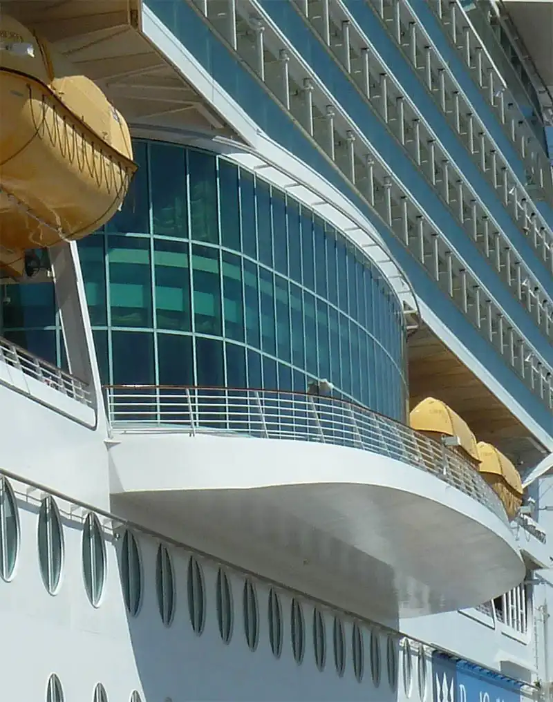 Первая отличительная черта, которая просто бросается в глаза — стеклянная капсула, которая словно парит в воздухе над кораблем на уровне 100 метров на морем! Это обзорная площадка, которая дает возможность обозрения на 360º! Дух захватывает от таких эмоций!