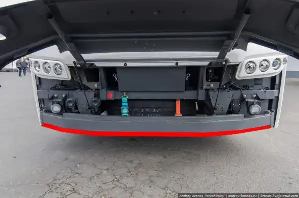 Любой объект: человек, мотоциклист, легковой автомобиль в случае ДТП будет подмят под многотонную махину. В железнодорожной технике, а также у магистральных грузовиков принят стандарт, подразумевающий установку так называемого противоподкатного бруса – низко расположенной балки, не позволяющей объектам оказаться раздавленным под кабиной. У R1 все как будто сделано с обратной целью!