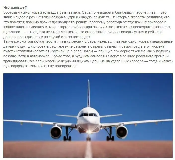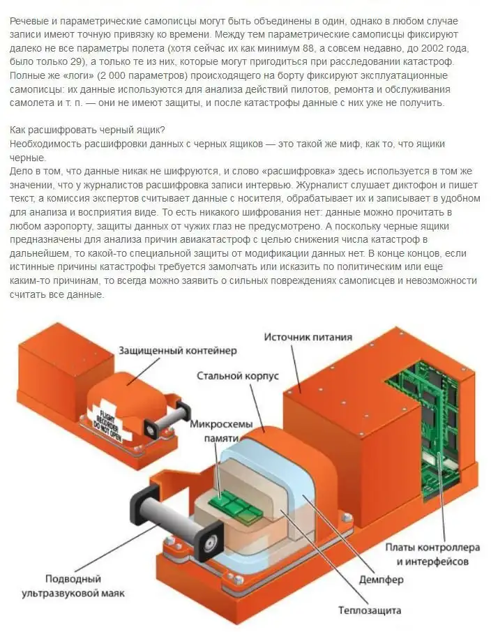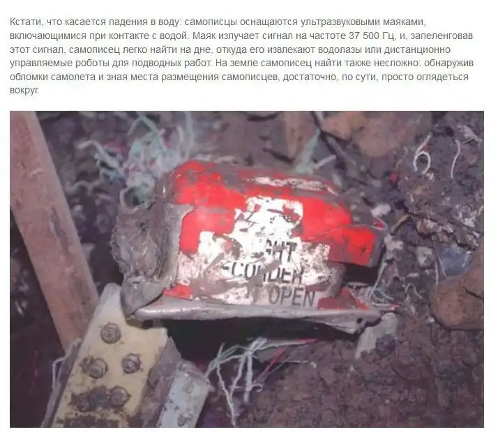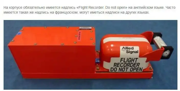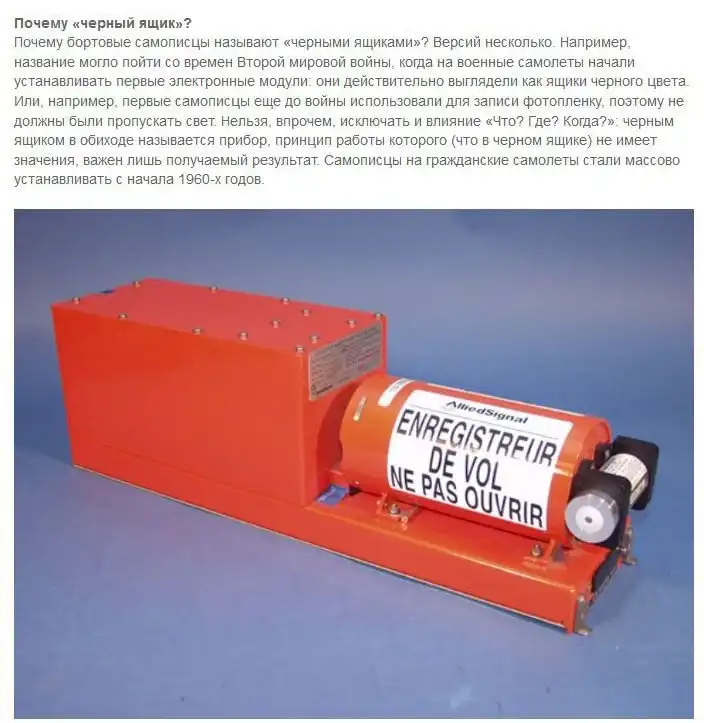 Устройство, которое обычно в народе называют "черным ящиком", и которое фиксирует все происходившие события на борту каждого самолета, на самом деле - оранжевого или красного цвета. Называется оно - бортовой самописец и имеет шарообразную или цилиндрическую форму, что повышает его прочность и противостоит внешним воздействиям, неизбежным при падении самолета.