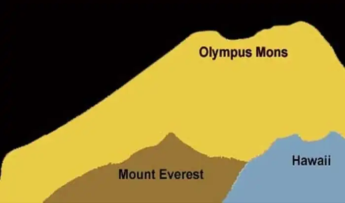 Гора Олимп, самая высокая в Солнечной Системе, находится на Марсе. Она в 3 раза выше Эвереста и буквально пронзает насквозь атмосферу Марса.