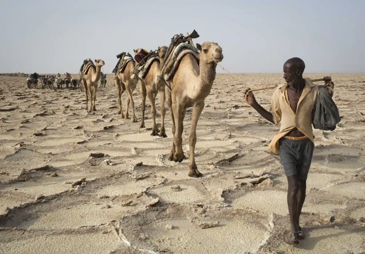 Жизнь всё ещё сурова для тысяч погонщиков верблюдов и добытчиков соли, которые используют традиционные мотыги и топоры, чтобы вырубать «белое золото» из грунта в Данакильской котловине.