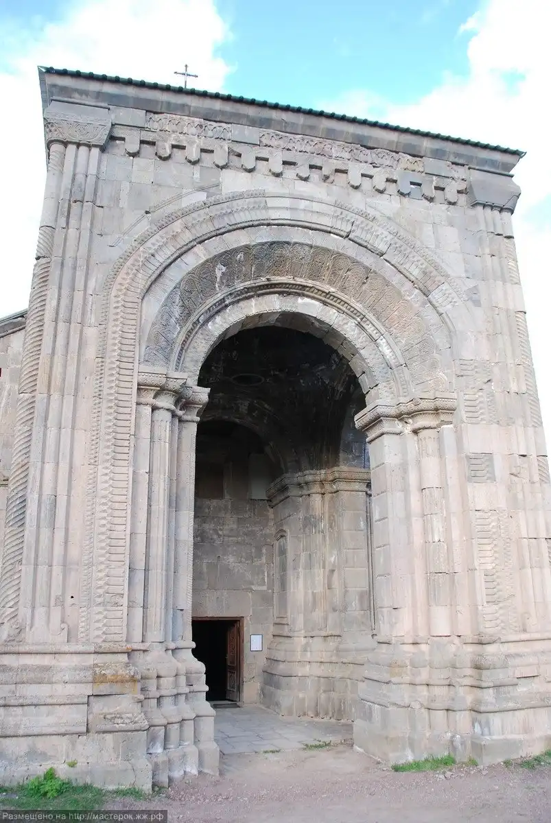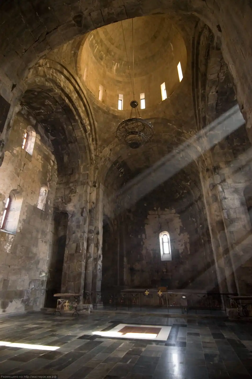 По внешнему периметру церкви как на восточной, так и на западной стороне расположены ризницы с полукруглыми нишами. Хотя по композиции она похожа на тип, именуемый купольной базиликой, однако имеет определенные отличия. В четырехугольном молельном зале на расстоянии 3 метров от главного алтаря расположена только одна пара купольных пилонов. С западной стороны ту же роль играют углы ризницы молельного зала. Посредством такого решения получился двухпилонный вариант упомянутого типа, что уже является новшеством. Первоначальный купол храма был разрушен еще во время землетрясения 1138 года. Барабан и купол вновь возведены в 1274 году.
