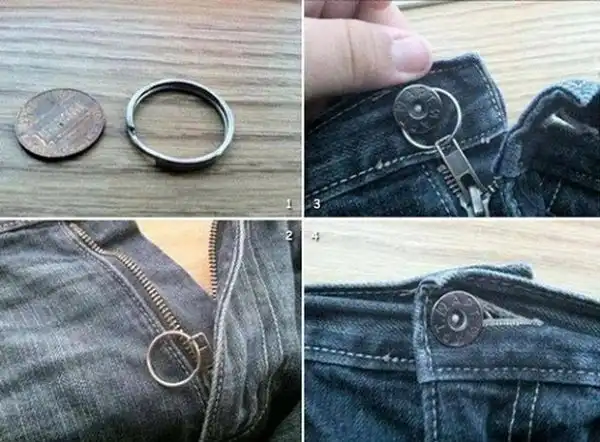 Если молния на ваших брюках постоянно предательски расстёгивается, то исправить положение сможет простое кольцо со связки ключей. Наденьте его на язычок молнии, а затем зацепите за пуговицу.