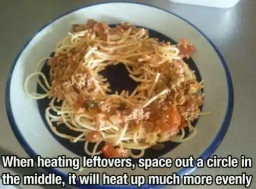 Если вы разогреваете еду в микроволновке, то расположите её в виде кольца. Так она будет нагреваться значительно равномернее.