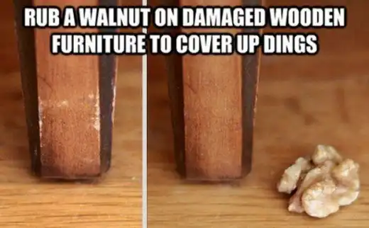 Для того, чтобы замаскировать царапины на деревянной мебели, натрите повреждённые места орехом. Подождите несколько минут, а потом нанесите второй слой.