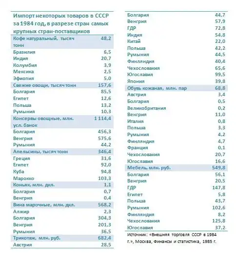 Правда и расходы были серьезные. Только поддержка коммунистических партий во всем мире сжирала огромные деньги, а там еще оборонку надо было поддерживать, государственные дачи строить. В общем, некоторые цифры того что и где закупал СССР в 1984 году можно посмотреть в таблице.