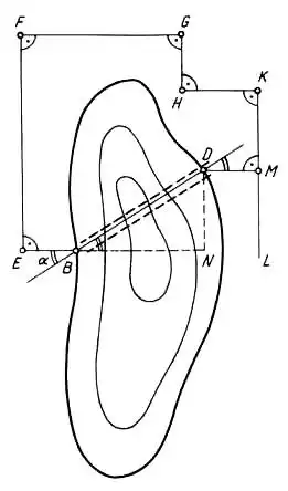 Точки B и D — входы в тоннель. Рядом с точкой B выбирается точка E, от нее вдоль горы строится отрезок EF, перпендикулярный отрезку BE. Далее в обход горы строится система взаимно перпендикулярных отрезков до тех пор, пока не получают линию КL, на которой выбирают точку M и строят от нее перпендикуляр MD ко входу в тоннель D. Используя линии DN и NB, получают треугольник BND и измеряют угол α.
