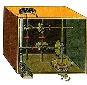 В книге этот механизм фигурирует под названием барулк. Видно, что это устройство представляет собой ни что иное, как редуктор, который используется в качестве лебедки.