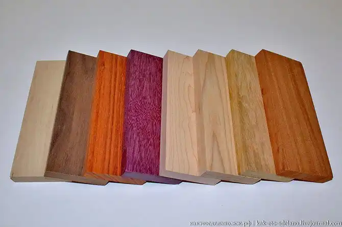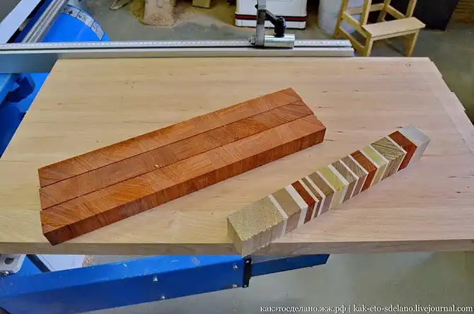 На этом фото можно видеть примеры склейки. Разноцветный отрезок склеен из различных сортов древесины. Из такого материала будет склеена одна из самых сложных в изготовлении досок. В конце поста можно будет ее увидеть.
