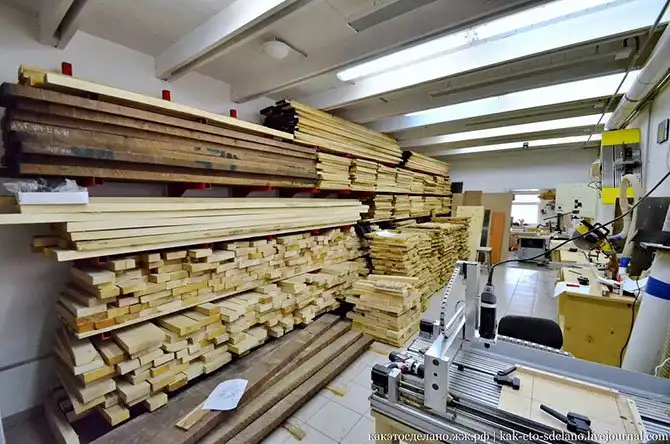 Как театр начинается с вешалки, так и мастерская, где делают деревянные изделия начинается со склада, где лежит древесина. К нашему мастеру, о работе которого сегодня пойдет речь, она поступает в готовом виде, сушеной при определенной температуре несколько лет. Свежую древесину использовать для производства досок нельзя, так как готовое изделие будет деформироваться со временем от усушки.