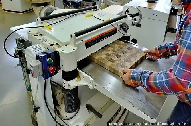 Ту доску с рептилиями мы пока не будем трогать, работа над ней будет проводится не один час, потому обработаем другую. После того, как она склеена, ее прогоняют через этот станок для шлифовки – рейсмус. По сути это современный рубанок.