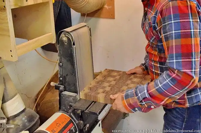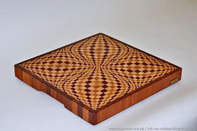 Мастер берет простую доску, обрабатывает ее, выравнивает грани. Затем доска режется на части, которые поворачиваются торцовой частью и склеиваются. Причем склейка делается не в произвольном порядке, а специальным образом, чтобы годичные кольца были направлены в противоположные стороны, это предотвратит доски от деформации при изменении влажности.