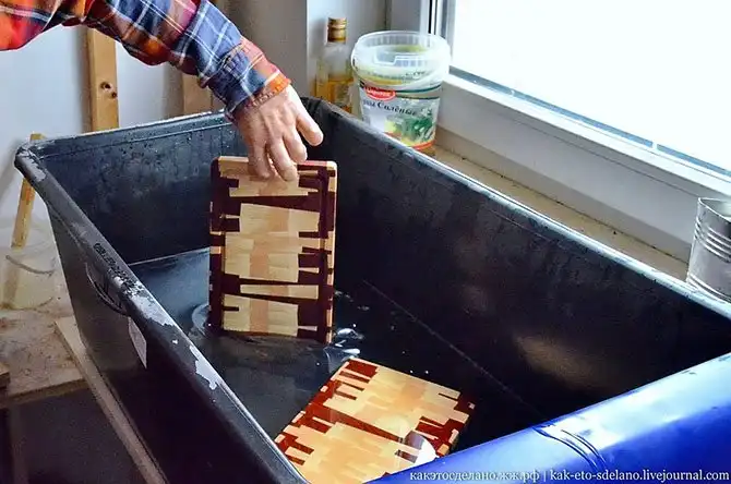После всех вышеперечисленных операций доска принимает ванну из минерального масла, которое не имеет ни вкуса, ни цвета, ни запаха. Масло производится из нефти, однако оно совершенно безопасно, и его даже применяют в косметической сфере.