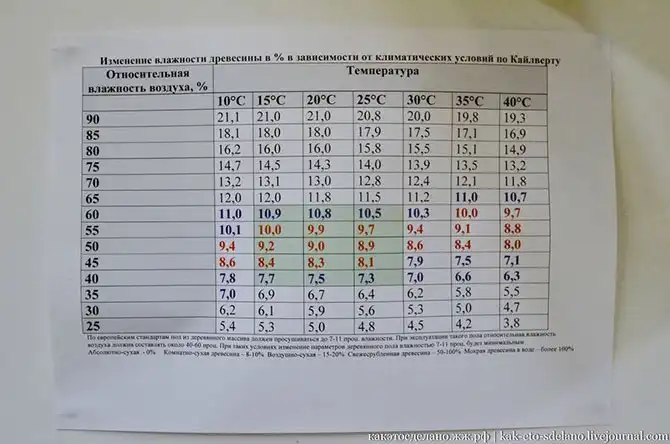 Здесь на складе поддерживается определенный температурный режим и влажность воздуха, которые не дают древесине слишком усохнуть и стать слишком влажной. На этой таблице, которая висит на стене мастерской виден оптимальный процент влажности при разной температуре.