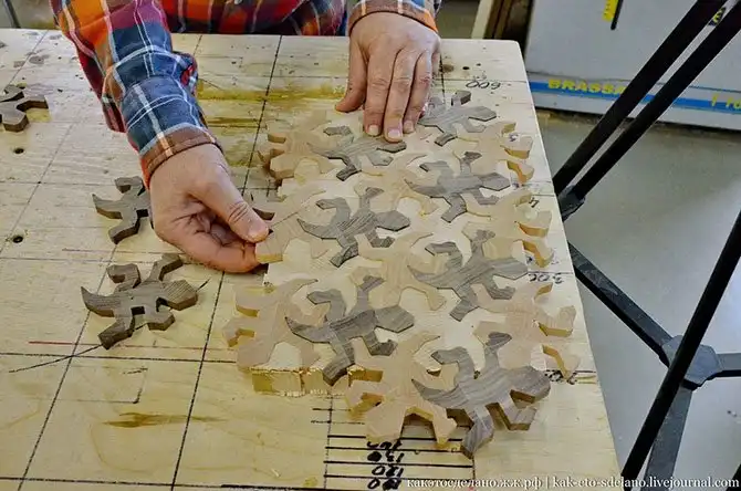 Как мне сказал мастер, станок вырезал фигуры на доске с таким расчетом, что вставляя другие фигуры рептилий не обнаруживается никаких зазоров. Фигурки оказываются пригнанными друг к другу очень плотно.