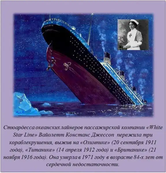 На "Британике" (или "Олимпике", всё время путаю), насколько я помню, погибло около тридцати человек. Все они находились в шлюпке, которую затянуло под винты. И единственной выжившей в этой шлюпке была эта самая стюардесса.