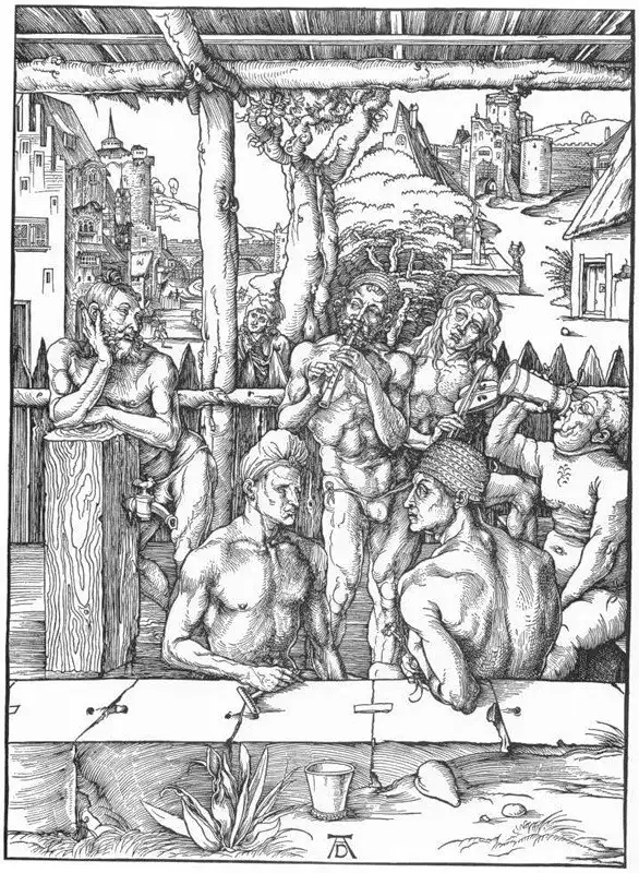 Альбрехт Дюрер, «Мужчины в бане», 1497 — пиво, разговоры, музыка, шапочки для парной
