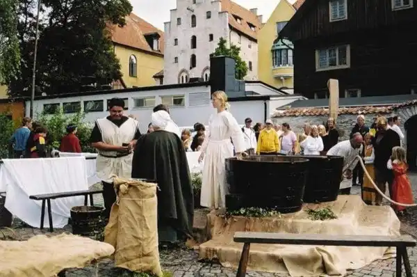 Вот современная реконструкция стандартной публичной «мыльни» XIV-XV веков, эконом-класс для бедных, бюджетная версия: деревянные бадьи прямо на улицах, воду кипятят в котлах: