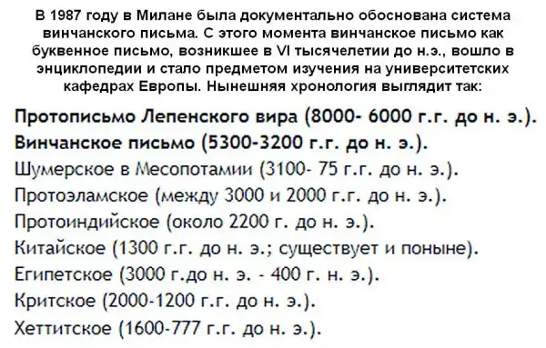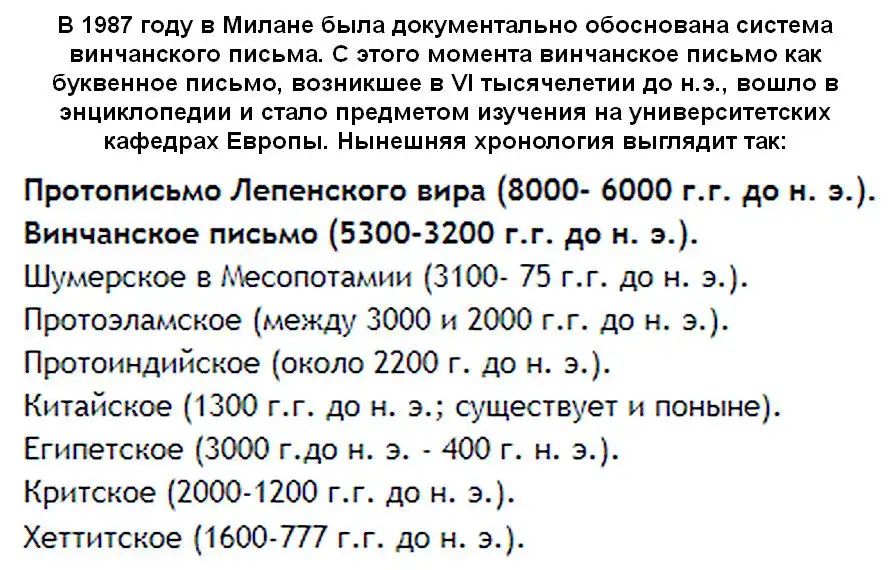 "Винчанская" цивилизация открыта в начале 20-го века в поселке Винча, под Белградом на берегу Дуная. Технология писания происходит в Винчанской цивилизации в то время, когда развитие других частей мира не может мериться с Винчой. В то время еще нет ни одного упоминания, о каких либо городских поселениях в Месопотамии, а до Рима ждать ещё боле 3000 лет. До организации ранних городов-государств пройдет еще много веков и поэтому столь раннее (6500-5500. гг. до.н.э.) появление употребления письма в среднем течении Дуная удивительно и очень значимо.