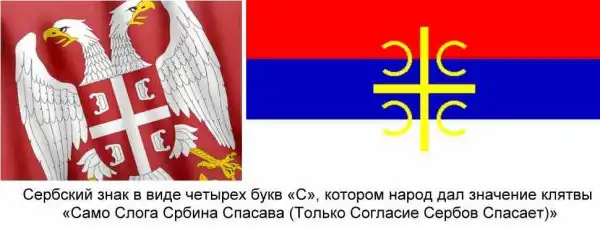 Сербский знак в виде четырех букв "С", котором народ дал значение клятвы "Само Слога Србина Спасава (Только Согласие Сербов Спасает)" присутствующий как в этрусских источниках, так и на могиле Александра Македонского, означает четыре огнива, то есть четыре фазы в кажущемся движении солнца, что представляло собой основу мировоззрения сербов. В начальном варианте знак "С" изображался на флагах династии Неманичей в виде солнца. Это шло от Ведической культуры, четыре части света в виде креста и четыре Солнца - востока, юга, запада, севера, и этот крест стал для сербов священным символом, вошедшим в лоно христианской цивилизации.