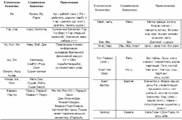 "Фараон" - слово, произошедшее от "фарао" (греч.), которое было выведено из египетского "Пер-оо" (переводится - Дом Великий). Имя русского Перуна есть производное от древнего "пер-оо". Этимологически слово "Перун" означает перван, т.е. первый; оно производно от древнеславянского "перъо", а по-египетски "пер-оо". Таким образом, египтяне Перуна звали Пер-оо, греки это слово исказили до "фараон". Фараонов же в Египте почитали за богов, считая их посланцами Верховного Бога в мире людей. Пер-оо (фараон) приходился сыном Осириса, то есть Гором. Тождество Гора и Пер-оо подтверждается и тем фактом, что каждый фараон именовался Гором, имел, так называемое, "горовое" имя. У германских племён громовержец Перун (первый) имел имя Один (тоже, первый).