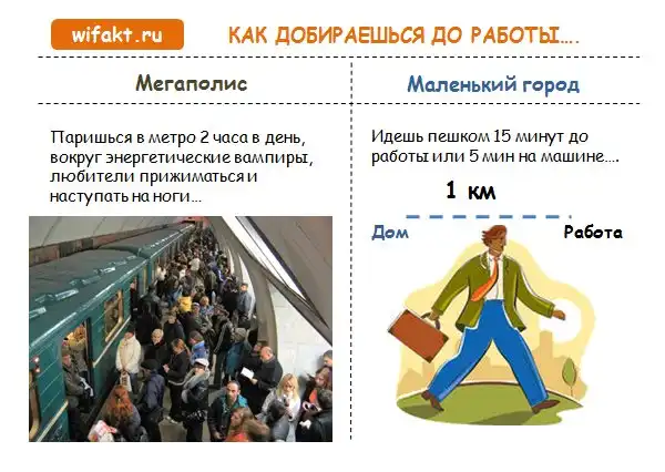 Все чаще жители мегаполисов, прежде всего столицы, подумывают о том чтобы переехать подальше от суеты в маленький город или деревню. Многие и переезжают. Кого-то останавливают трудности и остается мечтать, ну что ж, можно и мечтать, этого-то никто не сможет отнять. Просто должно быть у всех объективное понимание, что бытие определяет сознание: если живешь в огромном городе ты живешь по его законам - большие расстояния, гипермаркеты, хроническая усталость, метро и прочее, если живешь в маленьком городе жизнь более медленная, менее нервная, больше надо уметь руками делать, но и меньше денег понятно будет. Ну понятно везде есть минусы и плюсы, главное не бояться себе признаться что что-то не устраивает и уметь изменить свою жизнь в лучшую сторону!