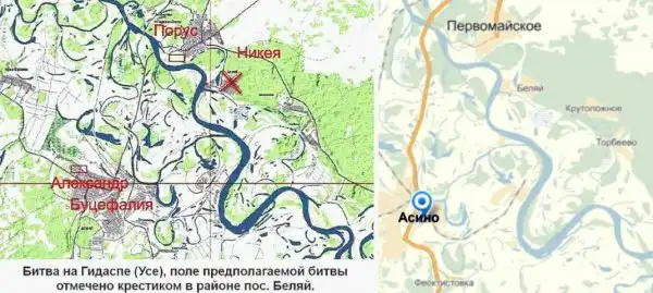 Asine, это несмненно, Асино, город в Томской области на берегу реки Чулым (Ус). Из греков, писавших о походе Александра в Индию, нам известно, что Александр после победы над Пором (Пор, Порос) на месте битвы основал ещё один город, - Никею, как раз на другом берегу реки, напротив Александрии Буцефальской. Сегодня мы видим, что напротив города Асино расположен посёлок Первомайский (Пышкино-Троицкое).