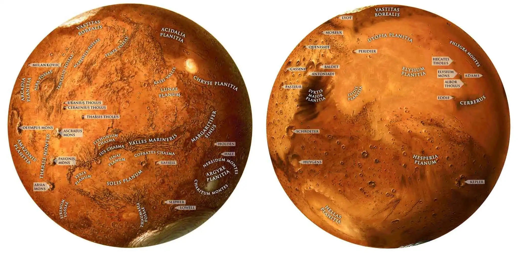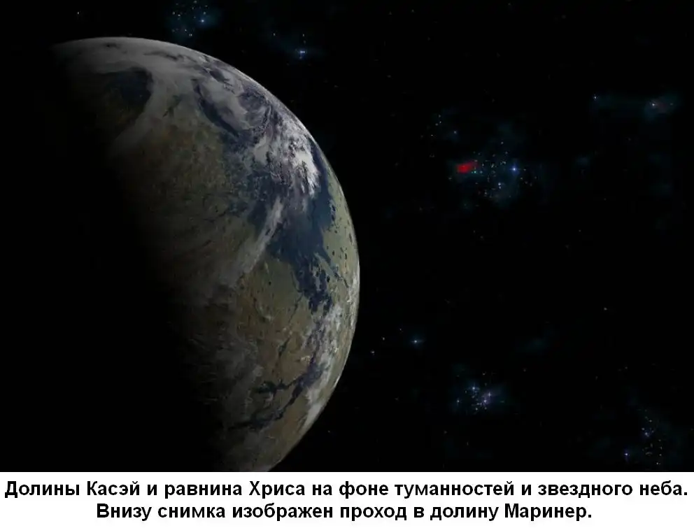 В то же время южная половина Марса - неровная и вся изрезана кратерами. Она примерно на 4-8 километров выше, чем северная часть. Недавние исследования предполагают, что такие различия между южной и северной сторонами планеты могли быть связаны с гигантским космическим телом, которое могло когда-то очень давно упасть на поверхность Марса.