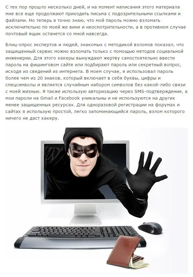 автор молодец. грамотно защитился. везде разные сложные пароли и смотрит от кого и что приходит. не ведется на фишинг. это практически полностью гарантирует защиту.