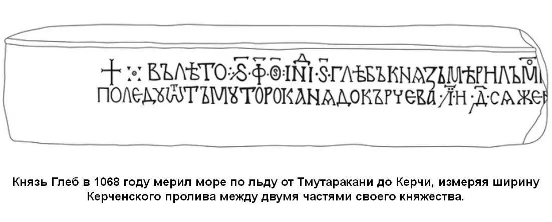 2. Надпись дословно говорит: "В лето 6576 индикт 6, Глеб, князь, мерил море по леду от Тмутаракани до Керчи 30 054 сажени". Т. е. князь Глеб в 1068 году мерил море по льду от Тмутаракани до Керчи, измеряя ширину Керченского пролива между двумя частями своего княжества.