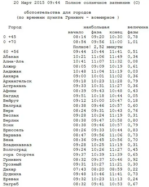 Обстоятельства солнечного затмения 20 марта 2015 года в городах России, СНГ и некоторых населенных пунктах Зарубежья, попадающих в область затмения.