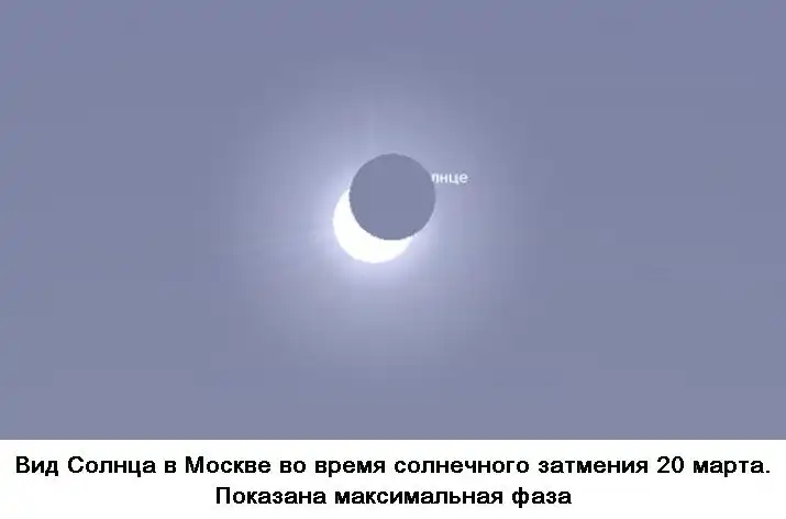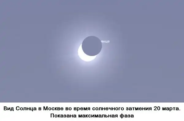 - Максимальная фаза солнечного затмения: 13:20 по московскому времени