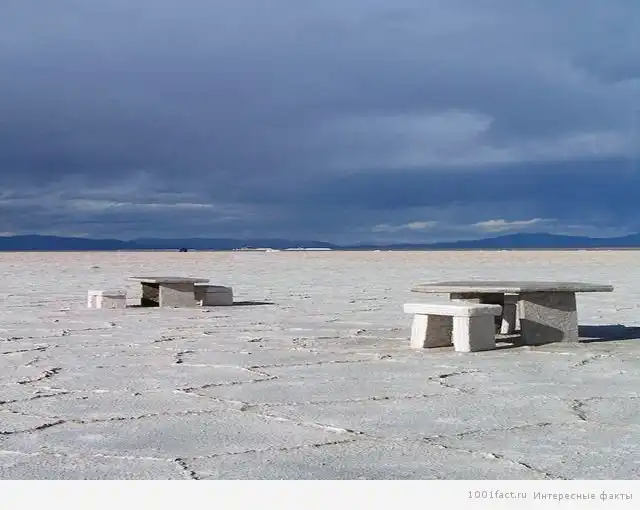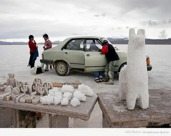 Взамен отдыхающие могут выпить воды, сидя за столом из цельных пластов соли и на таком же стуле, и полюбоваться на оставленные прежними туристами скульптуры или купить сувенир из соли.