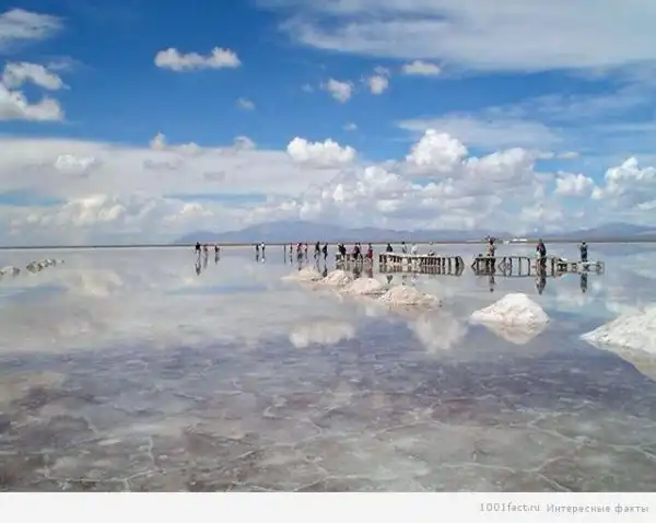 Но самый необыкновенный вид солончак приобретает вскоре после дождя. Тогда в залежах соли отражается небо, и появляется ощущение, будто ходишь в облаках. Вот только это явление редкое и недолгое. Дожди здесь практически не идут, а вода с горных хребтов стекает в прямоугольные углубления.