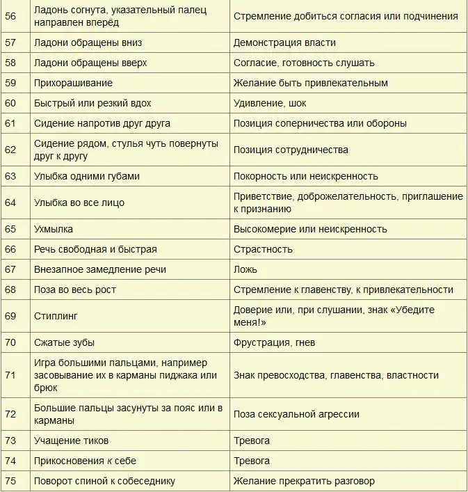 Когда мы ведем диалог с собеседником, информация передается не только из наших слов, но и из наших движений. Это называется языком тела, и связывают его с нашим подсознанием. Далеко не все могут правильно читать эти сигналы, в то время как именно они позволяют понять, что действительно на уме вашего оппонента. Освоить язык тела позволяют различные книги, одной из которых является «Язык тела. Впечатляйте, убеждайте и добивайтесь успеха с помощью языка тела» Макса Эггерта. Писатель собрал 75 сигналов, чаще всего посылаемых нашим телом собеседнику.