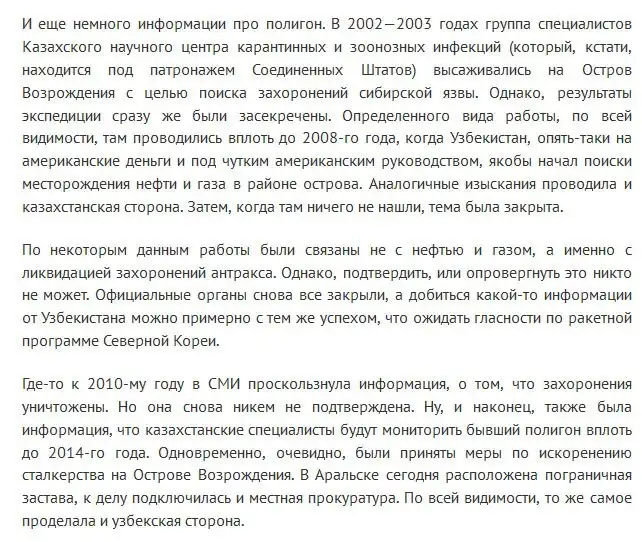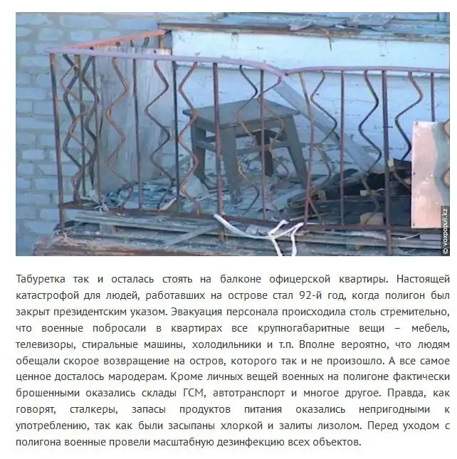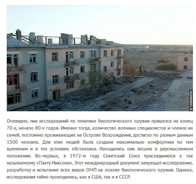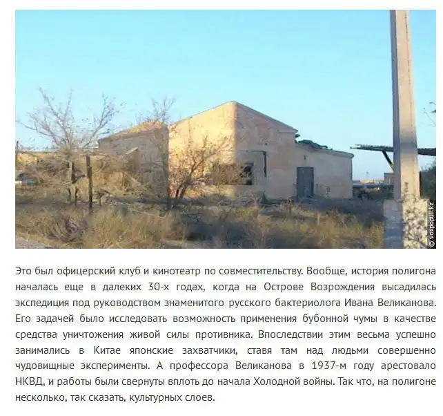 Далее вас ждет очень интересный и подробный репортаж о нынешней жизни, если это, конечно, можно так назвать, одного из самых секретных объектов СССР, расположенного на отдаленном острове в Аральском море. В 1992 году указом первого президента России объект «Аральск-7» был закрыт. С тех пор прошло много лет и место, где когда-то разрабатывали и проверяли в действии биологическое оружие, сейчас находится в очень плачевном состоянии.