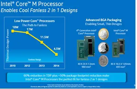 На графике слева на рис. 1 показано снижение тепловой мощности с 18 Вт в 2010 году до 4,5 Вт в процессоре Intel Core M. Это четырехкратное снижение за 4 года и снижение на 60 % по сравнению с 2013 годом. Справа на рис. 1 показано сравнение размеров процессора Intel® Core™ 4-го поколения с новым процессором Intel Core M. За счет уменьшения площади процессора примерно на 50 % удалось уменьшить место, занимаемое процессором на плате, примерно на 25 %.