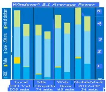 (Все тесты проведены на эталонных платформах Intel с 4 ГБ двухканальной памяти LPDDR3-1600 (2 модуля по 2 ГБ) с твердотельным накопителем Intel объемом 160 ГБ с операционной системой Windows 8.1. В системе с процессором Core M использовался BIOS версии 80.1, в системе с процессором Core i5-4302Y (предыдущего поколения) — BIOS версии WTM137. В обеих системах использовался драйвер Intel® HD Graphics версии 15.36.3650, а тепловая мощность составляла 4,5 Вт. Другие параметры: системная политика управления электропитанием: сбалансированная, адаптер беспроводной сети: включен, емкостью аккумулятора: 35 Вт-ч).